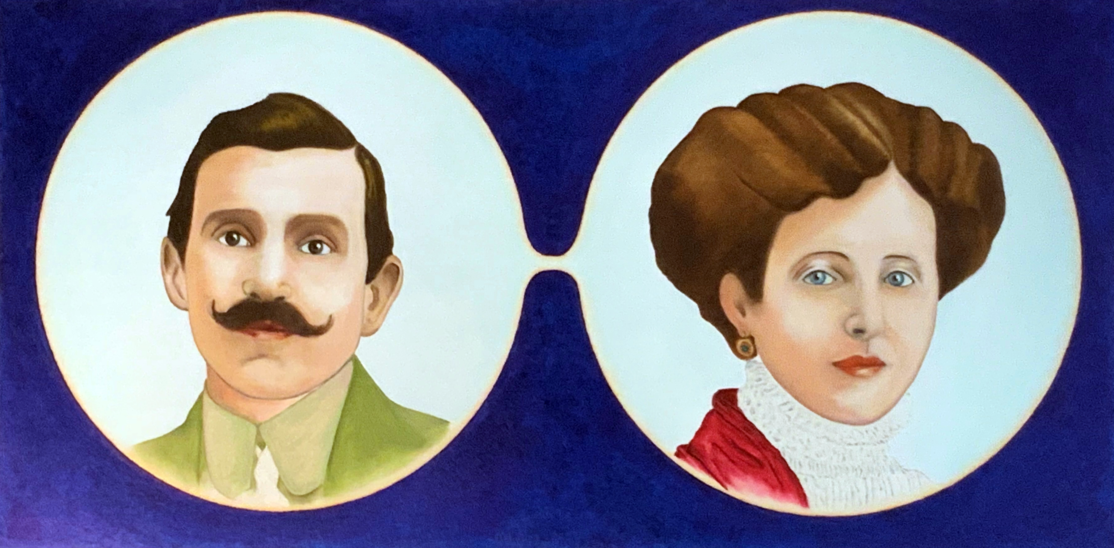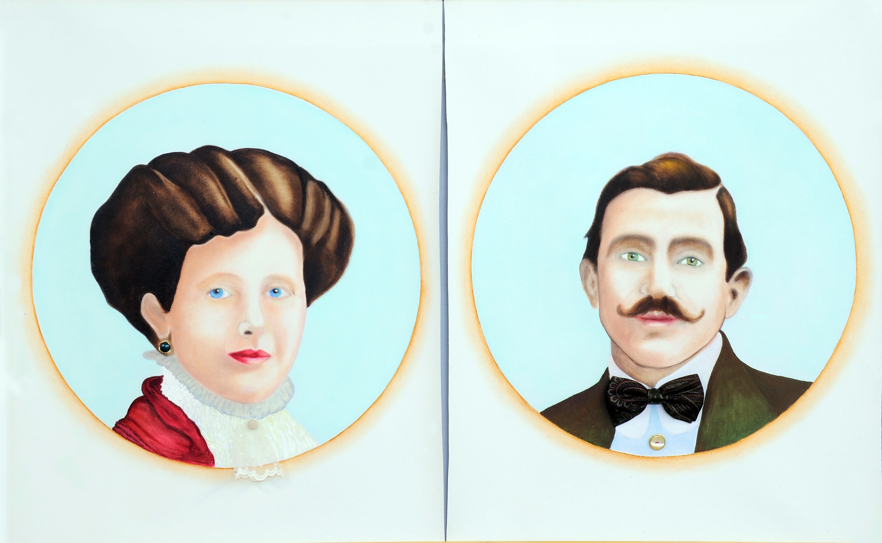 INSIEME, ritratto di Domitilla Piaggio e Celestino Satta, 2019 Intervención de Ana Márcia Varela. Díptico. Óleo sobre lienzo, 80 x 120 cm. Colección particular